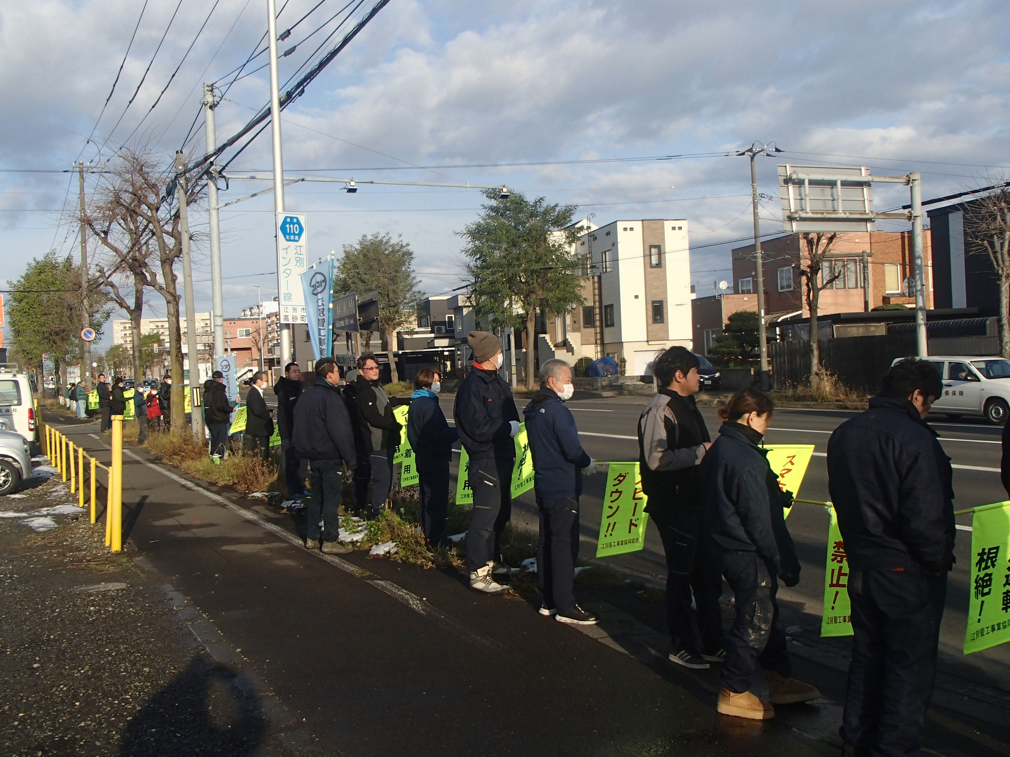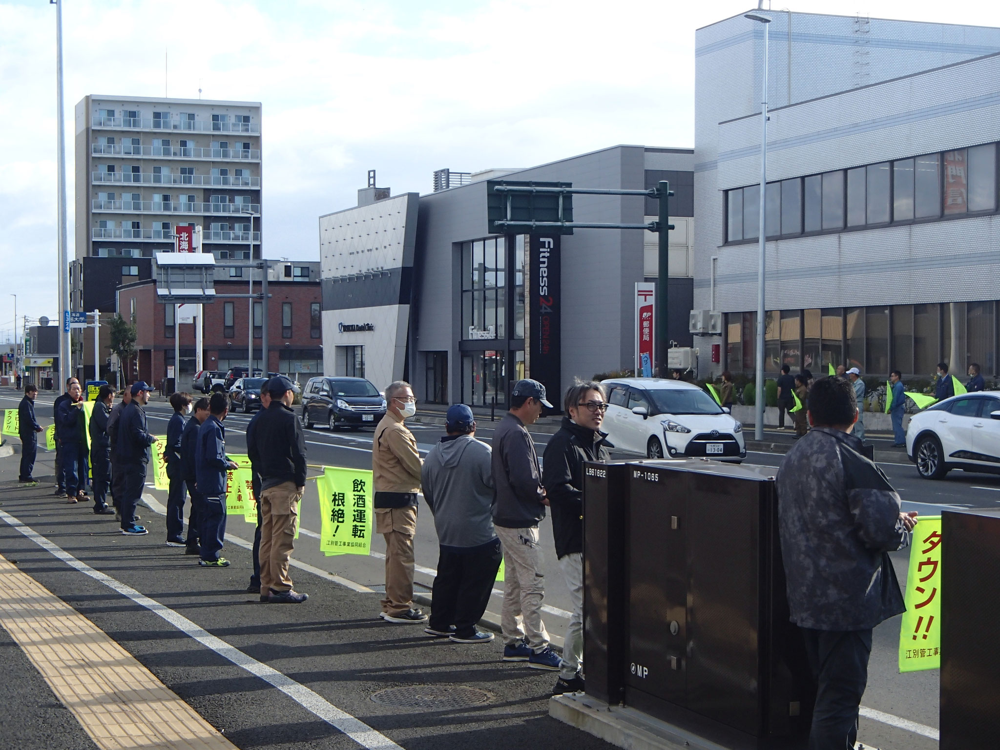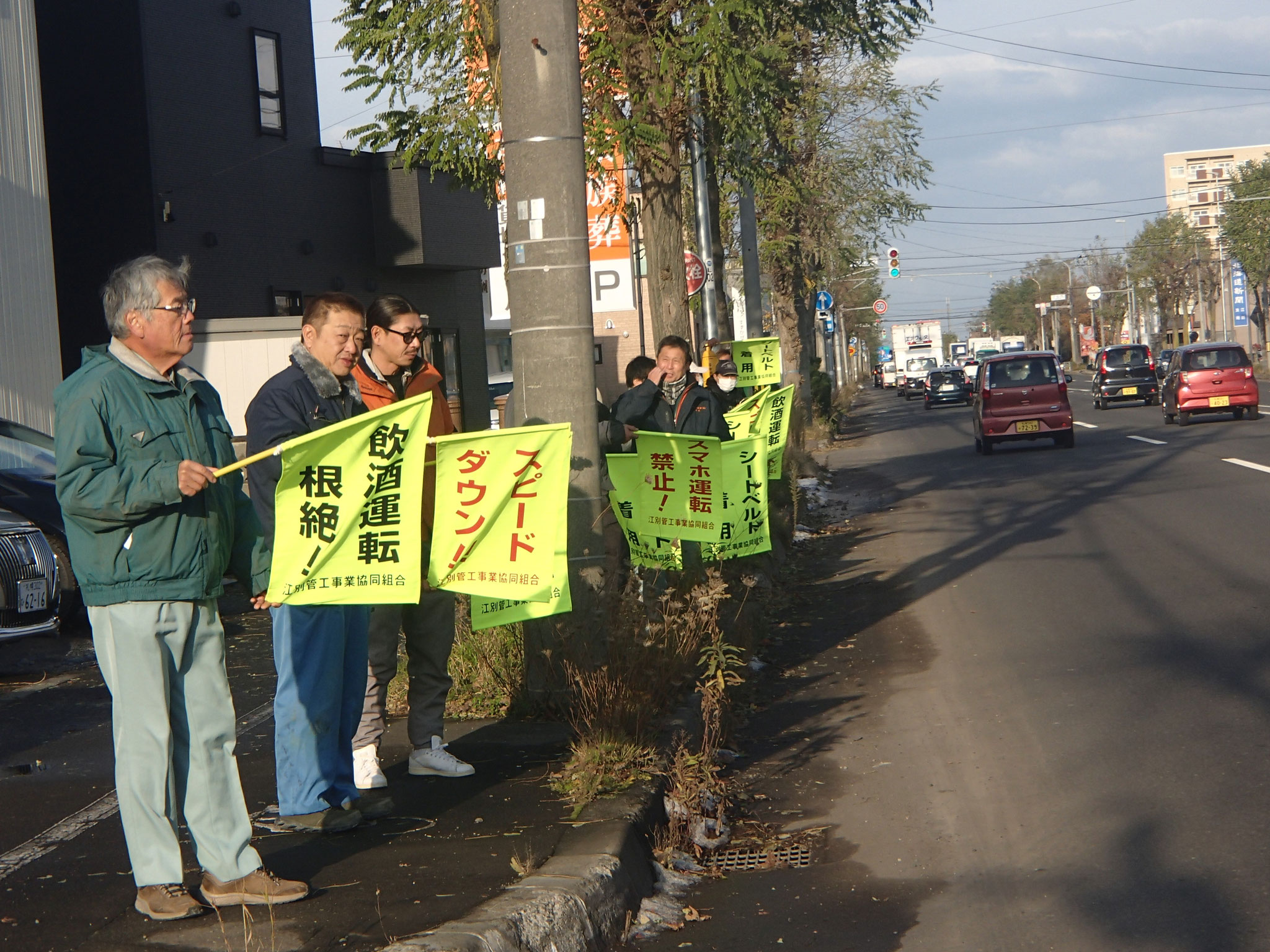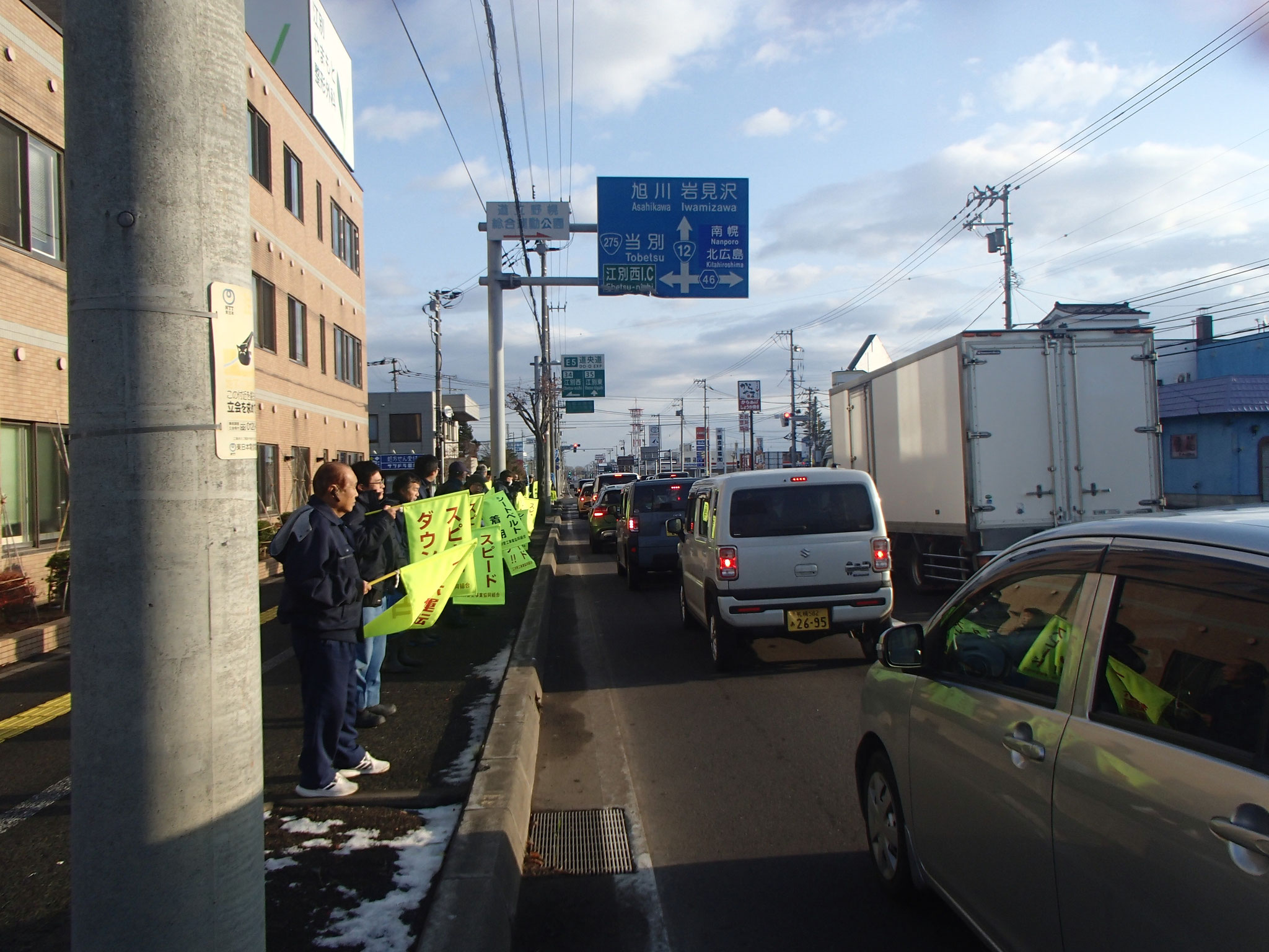 技術運営委員会の安全部会は、11月13日に冬の交通安全運動の一環として、㈱龍田工務店前の国道12号線・江別恵庭線沿いで旗の波街頭啓発を行いました。75名が参加しました。旗の波街頭啓発の実施は今年で14年目、49回目となります。